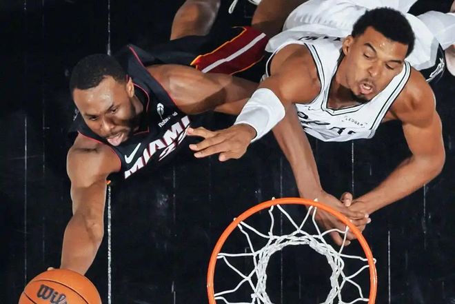 虽然目前数据样本还不够多,但截至目前来看,文班亚马今年的表现,提升太明显了。今天击败热火的比赛,文班亚马继续强势表现,23投10中,三分球5投1中,罚球8罚6中,狂砍27分18篮板6助攻1抢断5盖帽,这数据,25+15+5+5帽,太吓人了。可以说,今天他对位5年1.63亿中锋阿德巴约,把这位“小魔兽”打爆了,后者27投12中,三分球13投4中,几乎一半的出手都飘在外线,很惧怕跟文班亚马到内线硬刚。